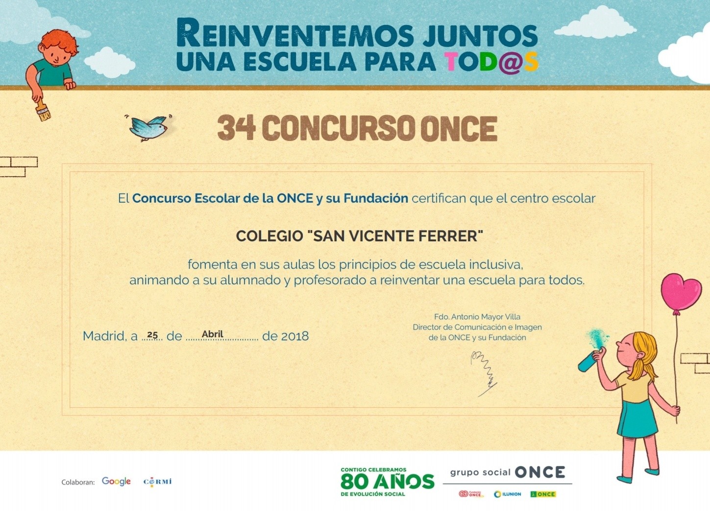 Diploma de participación en el concurso ONCE curso 2017-2018.