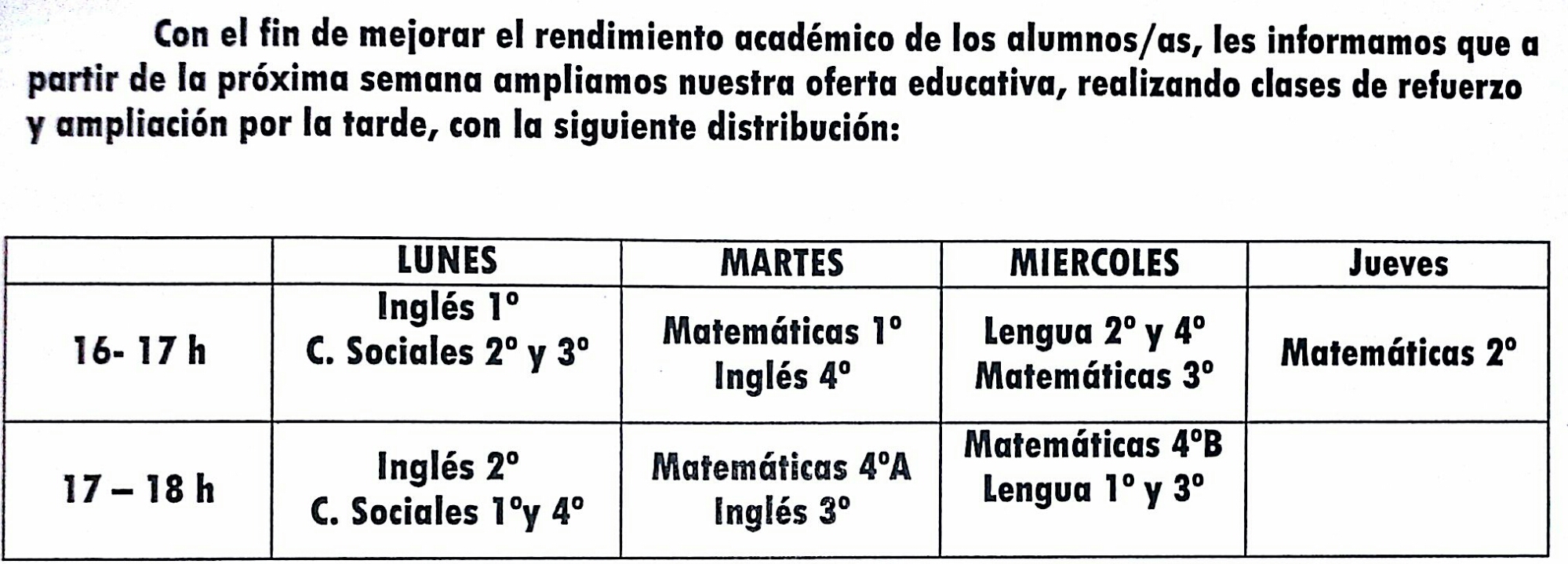 Plan de Refuerzo Educativo para Secundaria sanvi Publicado el 22/01/2015 Publicado en noticias Ya está en marcha el Plan de Refuerzo Educativo para los alumnos de Secundaria. Gracias a esta iniciativa, se imparten clases gratuitas en horario extraescolar conforme al siguiente horario: Con su ayuda creamos un futuro mejor.