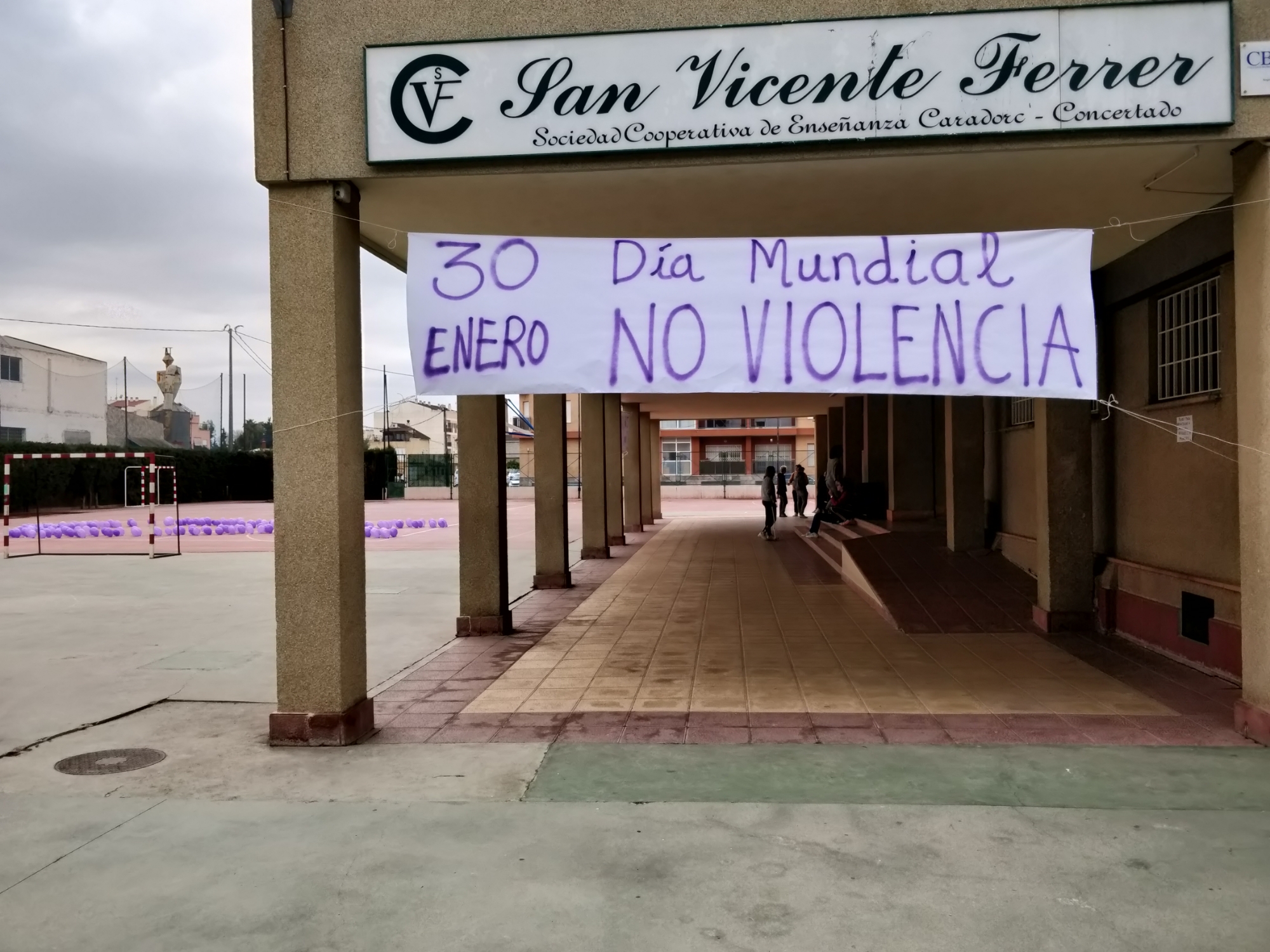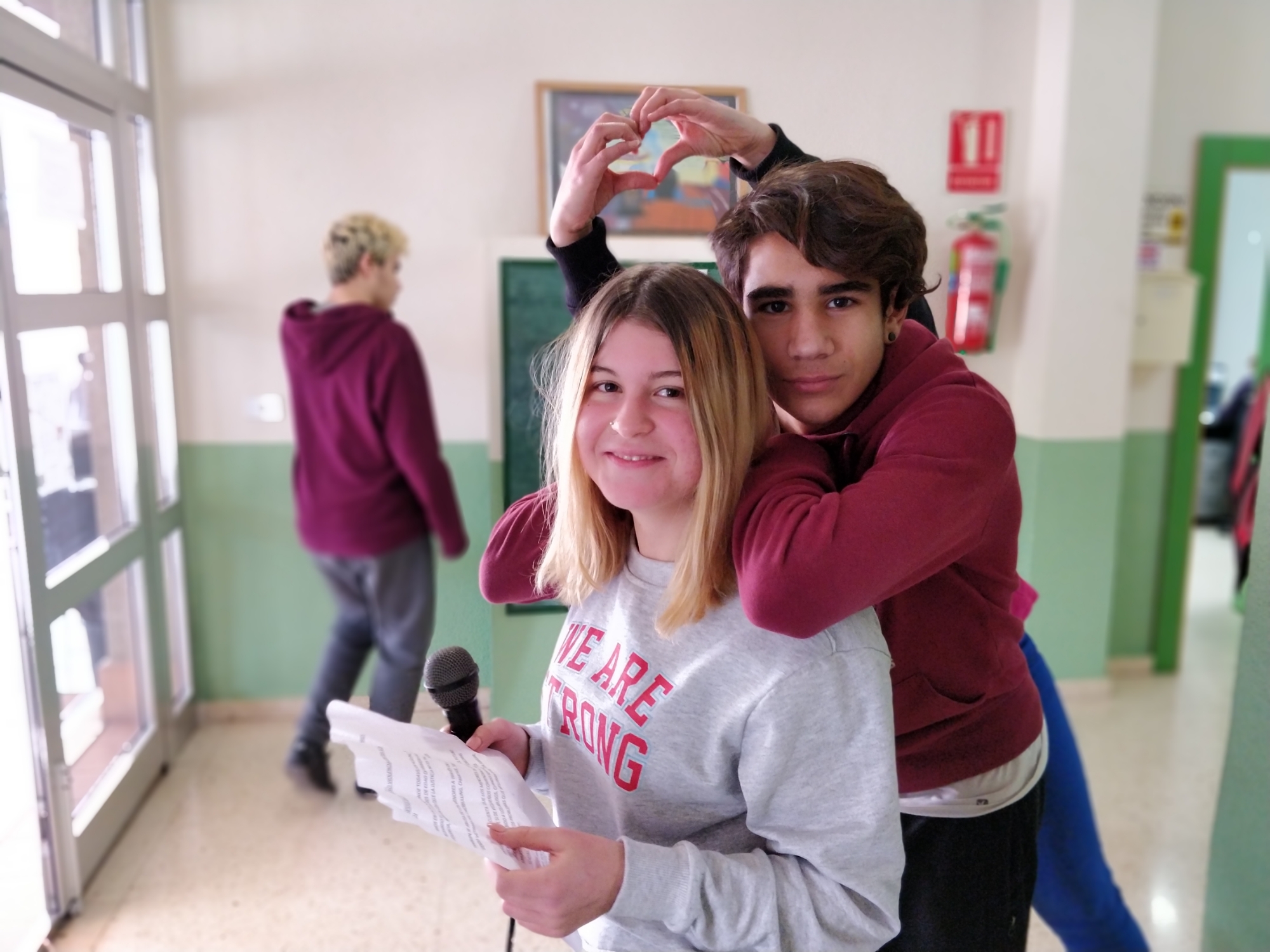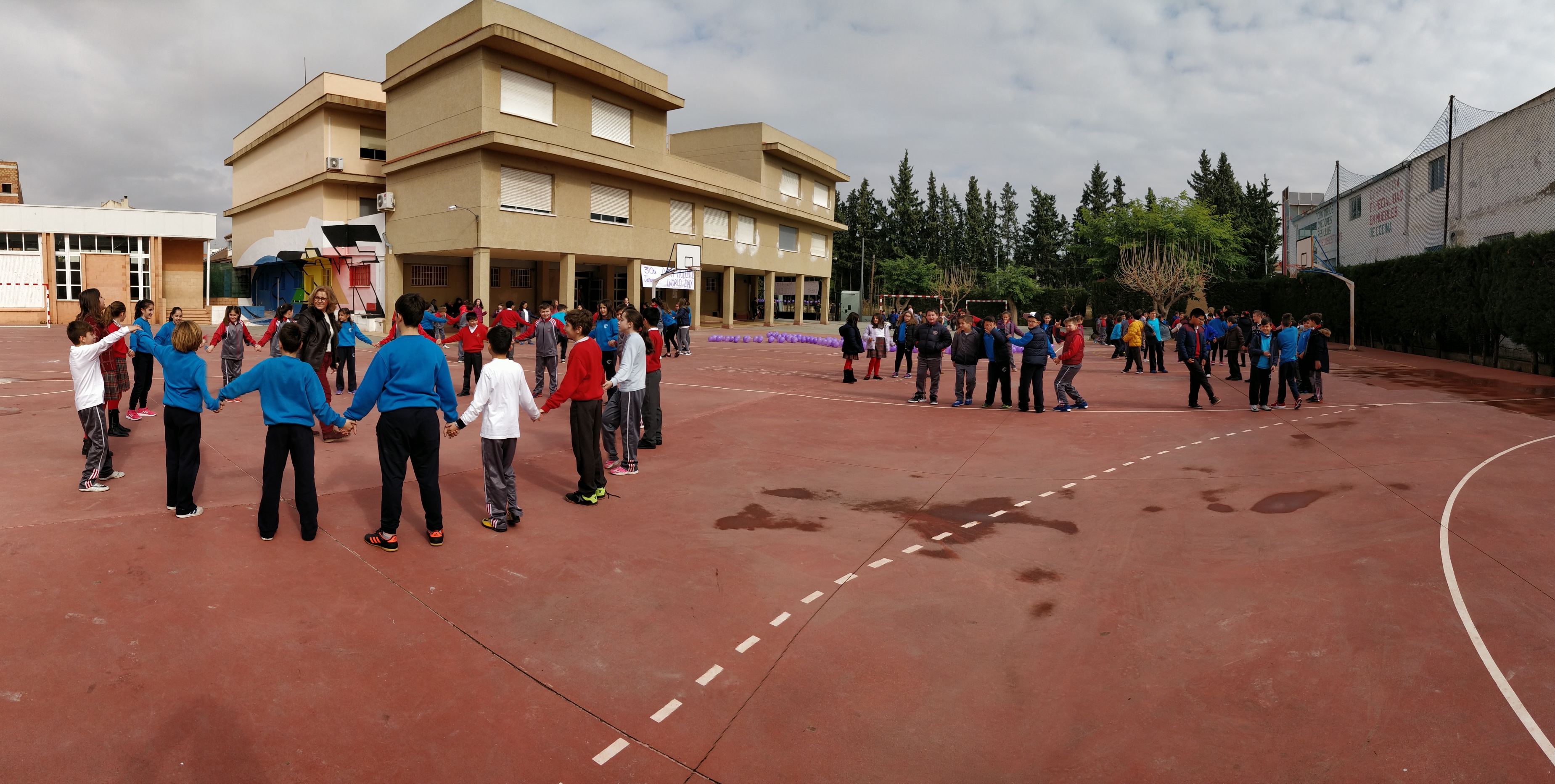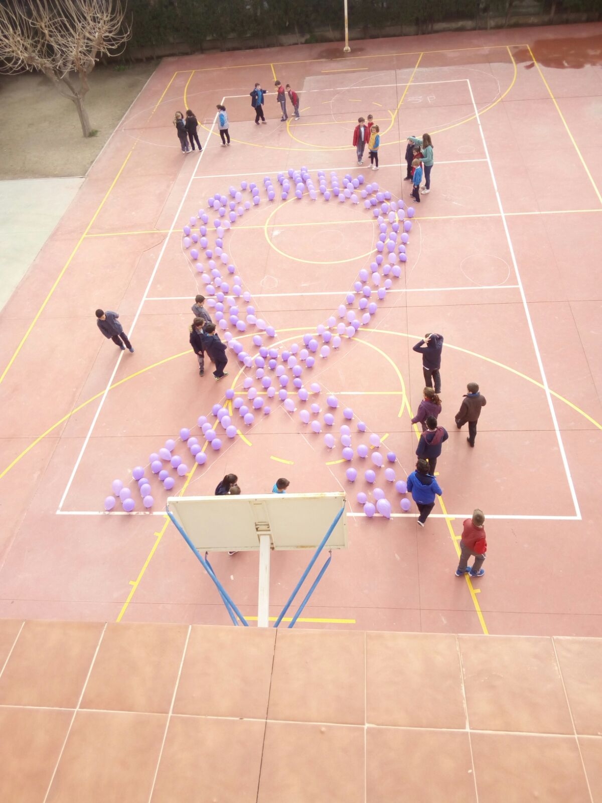 La segunda actividad, en la que participaron todos los alumnos del centro, consistió en la lectura de unos manifiestos escritos por los alumnos de secundaria y la escucha de dos canciones míticas sobre la Paz, mientras los alumnos de primaria escuchaban en círculo junto a un gran lazo hecho con globos.