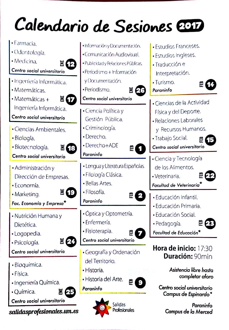 Dentro del Programa de Orientación Académica y Profesional, se facilita a las familias y alumnos de este centro información acerca de la celebración de 15 sesiones informativas sobre las salidas profesionales de las titulaciones de Grado de la Universidad de Murcia, de asistencia libre y gratuita. Podrá encontrar información detallada en la web www.um.es/coie